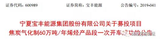 ????????公告顯示,焦炭氣化制60萬(wàn)噸/年烯烴項(xiàng)目是寶豐能源首發(fā)上市募集資金投資項(xiàng)目,項(xiàng)目總投資金額達(dá)152.79億元。該項(xiàng)目主要分為兩段:前段焦炭氣化制220萬(wàn)噸/年甲醇項(xiàng)目,后段甲醇制60萬(wàn)噸/年聚烯烴項(xiàng)目,以及相關(guān)配套公用工程,預(yù)計(jì)將于2019年底前全部建成投產(chǎn)。