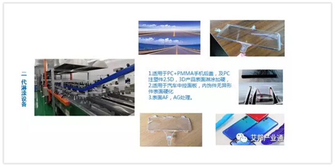 ????????二代淋涂設備主要應用于PC+PMMA手機后蓋,及PC注塑件2.5D,3D產品、汽車中控面板,內飾件無異形件表面硬化、表面AF、AG處理。
