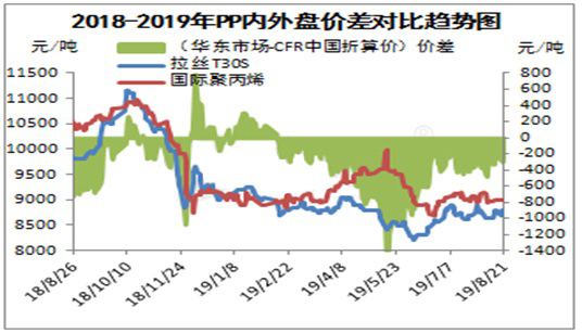 ????????聚丙烯內外盤價差貼近,國內擴能消息不斷,進口資源在國內優勢占比下降,同時中美貿易摩擦不斷,人民幣兌美元匯率不斷貶值,加劇PP美金國內競爭壓力,出口窗口能否開啟?