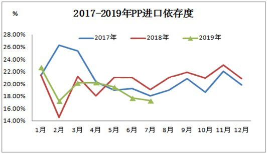 ????????由2017-2019年PP進口依存度發現,2019年4月份進口依存度開始逐步下挫,7月進口依存度同比下降1.82%,環比下降0.42%。由此數據可發現進口PP產品在國內依存度呈現逐步下降趨勢。其實這與國內PP產能激增密不可分,進口PP產品由于整體價高,在國內市場競爭優勢逐步減弱,除部分高端專用產品在下游仍占據優勢外,按照目前國內PP擴能計劃逐步實現,進口PP在國內依存度有進一步下降趨勢。