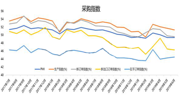 ????????值得注意的是,隨著中美貿易戰的不斷升級,市場信心指數嚴重受損。PMI指數已經連續兩個月在榮枯分界線以下,這表明當前經濟下行壓力不容小覷。新訂單指數連續兩個月在下降,一直是在榮枯分界線以下,這也說明企業整體訂單的情況不好,尤其新出口訂單是出現明顯下滑,上半年出口訂單受趕出口影響出現反彈,但下半年出口會出現回落。外部環境導致的外需下滑,以及它給整個經濟增長帶來的壓力,是不容低估的。