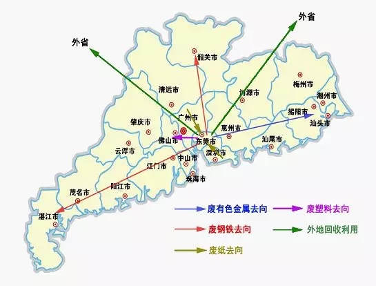 ????????目前,東莞市廢紙主要在本地造紙廠回收利用;廢塑料主要流向佛山等珠三角地區的塑料造粒加工企業;廢鋼鐵主要運往韶關、湛江、省外城市等地區進行冶煉;廢有色金屬、廢電子主要流向粵東進行回爐再用。