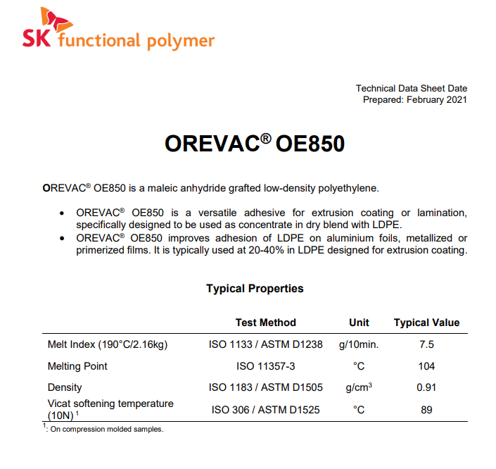 - 阿科瑪Orevac® OE850粘結(jié)樹脂粘結(jié)樹脂 物性表, 阿科瑪Orevac® OE850粘結(jié)樹脂粘結(jié)樹脂 產(chǎn)品參數(shù),阿科瑪Orevac® OE850粘結(jié)樹脂粘結(jié)樹脂 性能表,阿科瑪Orevac® OE850粘結(jié)樹脂粘結(jié)樹脂 出廠報告, MSDS,, 物質(zhì)安全資料表, UL黃卡,{ SGS報告, RoHS, 食品級認證, NSF飲用水標準, 產(chǎn)品資料, 產(chǎn)品性能, 出廠報告, 原廠原包, 代理商, 熱變形溫度, 熔指數(shù), 流動系數(shù), 抗沖擊性能、沖擊強度, 低溫韌性、低溫抗沖擊性能, 熔體流動系數(shù)、熔體流動速率, 加工工藝、加工參數(shù)、加工溫度, 歐盟RoHS 德國FDA 美國FDA 日本FDA