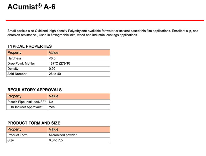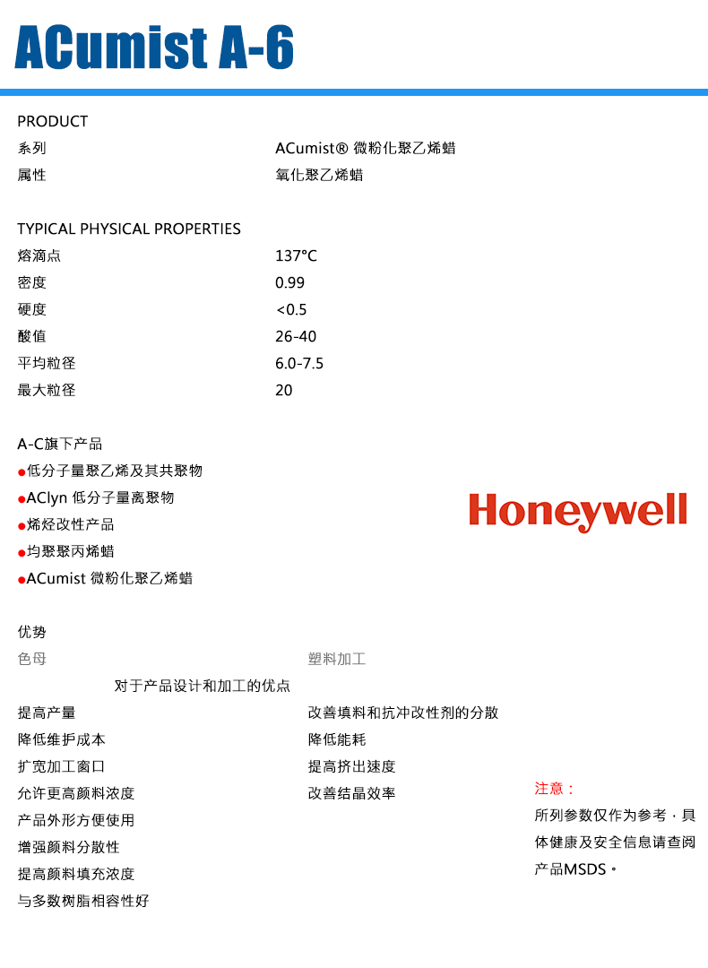 - 霍尼韋爾蠟粉 ACumist A-6 微粉化氧化聚乙烯蠟 物性表, 霍尼韋爾蠟粉 ACumist A-6 微粉化氧化聚乙烯蠟 產(chǎn)品參數(shù),霍尼韋爾蠟粉 ACumist A-6 微粉化氧化聚乙烯蠟 性能表,霍尼韋爾蠟粉 ACumist A-6 微粉化氧化聚乙烯蠟 出廠報(bào)告, MSDS,, 物質(zhì)安全資料表, UL黃卡,{ SGS報(bào)告, RoHS, 食品級(jí)認(rèn)證, NSF飲用水標(biāo)準(zhǔn), 產(chǎn)品資料, 產(chǎn)品性能, 出廠報(bào)告, 原廠原包, 代理商, 熱變形溫度, 熔指數(shù), 流動(dòng)系數(shù), 抗沖擊性能、沖擊強(qiáng)度, 低溫韌性、低溫抗沖擊性能, 熔體流動(dòng)系數(shù)、熔體流動(dòng)速率, 加工工藝、加工參數(shù)、加工溫度, 歐盟RoHS 德國(guó)FDA 美國(guó)FDA 日本FDA