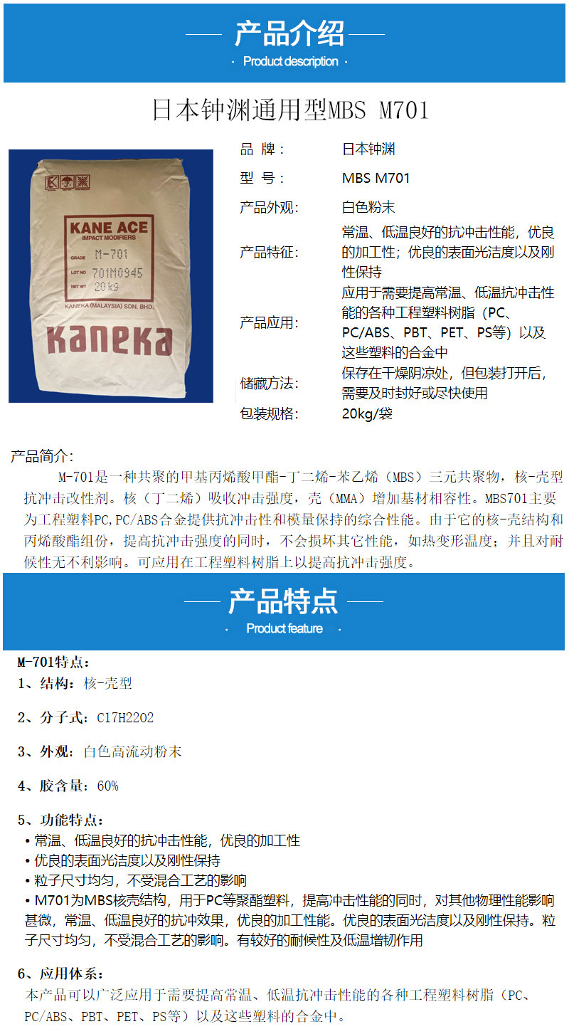 - 日本鐘淵MBS M701增韌劑 PC/ABS合金抗沖擊劑 增韌改性鐘淵mbs701 物性表, 日本鐘淵MBS M701增韌劑 PC/ABS合金抗沖擊劑 增韌改性鐘淵mbs701 產品參數,日本鐘淵MBS M701增韌劑 PC/ABS合金抗沖擊劑 增韌改性鐘淵mbs701 性能表,日本鐘淵MBS M701增韌劑 PC/ABS合金抗沖擊劑 增韌改性鐘淵mbs701 出廠報告, MSDS,, 物質安全資料表, UL黃卡,{ SGS報告, RoHS, 食品級認證, NSF飲用水標準, 產品資料, 產品性能, 出廠報告, 原廠原包, 代理商, 熱變形溫度, 熔指數, 流動系數, 抗沖擊性能、沖擊強度, 低溫韌性、低溫抗沖擊性能, 熔體流動系數、熔體流動速率, 加工工藝、加工參數、加工溫度, 歐盟RoHS 德國FDA 美國FDA 日本FDA