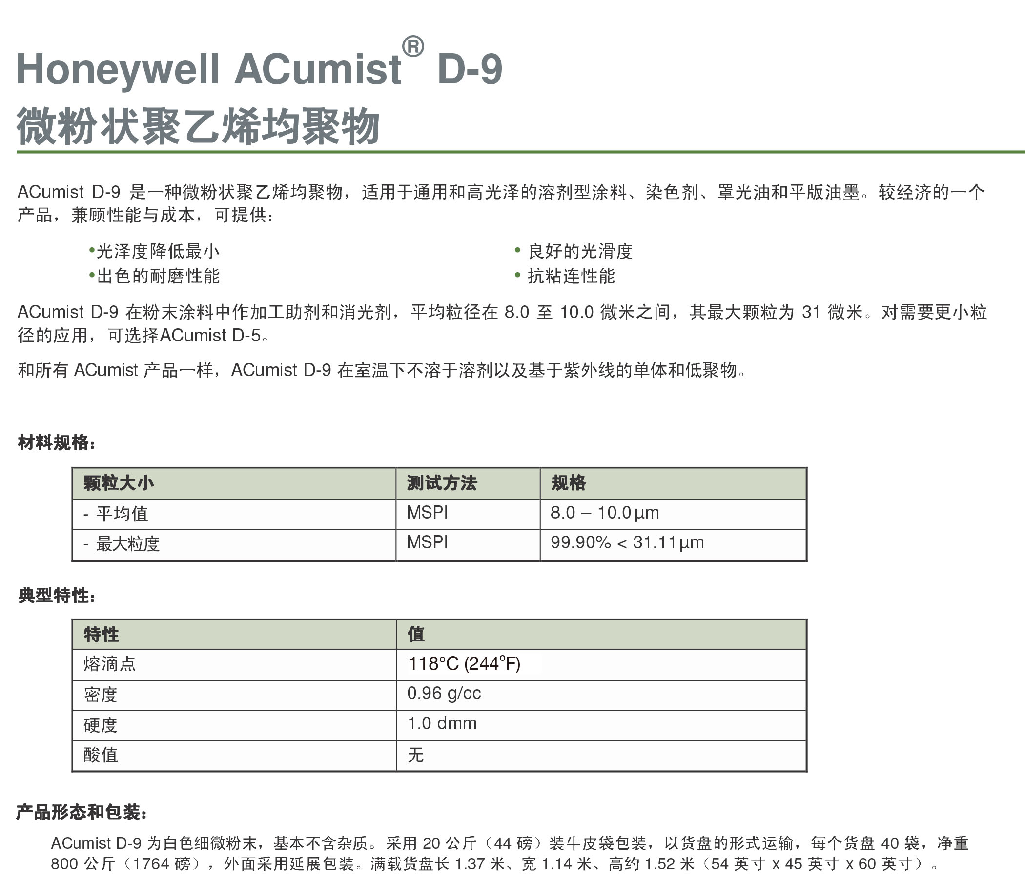 - 美國霍尼韋爾蠟粉 D-9 經濟型的聚乙烯微粉D9 物性表, 美國霍尼韋爾蠟粉 D-9 經濟型的聚乙烯微粉D9 產品參數,美國霍尼韋爾蠟粉 D-9 經濟型的聚乙烯微粉D9 性能表,美國霍尼韋爾蠟粉 D-9 經濟型的聚乙烯微粉D9 出廠報告, MSDS,, 物質安全資料表, UL黃卡,{ SGS報告, RoHS, 食品級認證, NSF飲用水標準, 產品資料, 產品性能, 出廠報告, 原廠原包, 代理商, 熱變形溫度, 熔指數, 流動系數, 抗沖擊性能、沖擊強度, 低溫韌性、低溫抗沖擊性能, 熔體流動系數、熔體流動速率, 加工工藝、加工參數、加工溫度, 歐盟RoHS 德國FDA 美國FDA 日本FDA