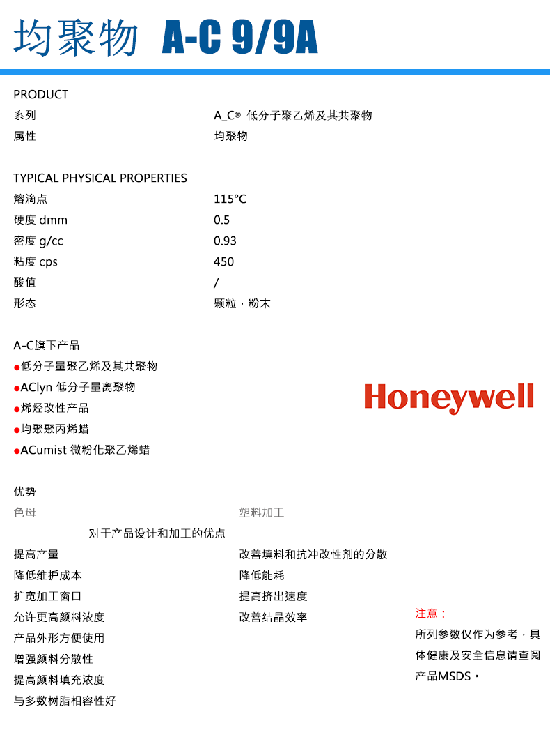 - 霍尼韋爾 A-C® 9A 低密度聚乙烯 (LDPE) 均聚物 物性表, 霍尼韋爾 A-C® 9A 低密度聚乙烯 (LDPE) 均聚物 產(chǎn)品參數(shù),霍尼韋爾 A-C® 9A 低密度聚乙烯 (LDPE) 均聚物 性能表,霍尼韋爾 A-C® 9A 低密度聚乙烯 (LDPE) 均聚物 出廠報告, MSDS,, 物質(zhì)安全資料表, UL黃卡,{ SGS報告, RoHS, 食品級認(rèn)證, NSF飲用水標(biāo)準(zhǔn), 產(chǎn)品資料, 產(chǎn)品性能, 出廠報告, 原廠原包, 代理商, 熱變形溫度, 熔指數(shù), 流動系數(shù), 抗沖擊性能、沖擊強(qiáng)度, 低溫韌性、低溫抗沖擊性能, 熔體流動系數(shù)、熔體流動速率, 加工工藝、加工參數(shù)、加工溫度, 歐盟RoHS 德國FDA 美國FDA 日本FDA