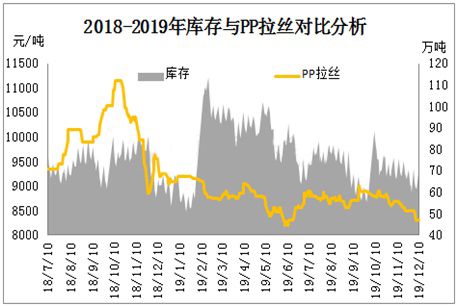 2019年12月庫存顯示整體呈現(xiàn)震蕩下滑趨勢,整體庫存維持在60-70萬噸/年,但全球經(jīng)濟偏弱運行及國內(nèi)實體企業(yè)訂單力度不及預(yù)期,市場原料消耗力度受到制約。同時2019年P(guān)P新一輪擴能高峰期再次來臨,浙江石化及大連恒力等大型聚烯烴裝置落地試運行,市場供需壓力更加凸顯,加快現(xiàn)貨市場拉絲下挫壓力。