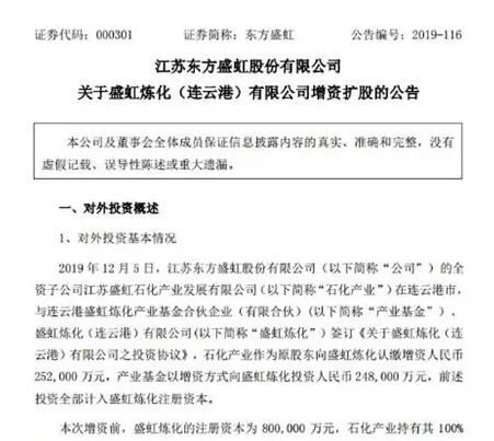 本次增資前,盛虹煉化的注冊資本為800,000萬元,石化產業持有其100%股權;本次增資后,盛虹煉化的注冊資本為1,300,000萬元,石化產業持有其80.92%股權,產業基金持有其19.08%股權。 2019年12月5日,東方盛虹以通訊表決方式召開第七屆董事會第三十八次會議,會議審議通過了《關于盛虹煉化(連云港)有限公司增資擴股的議案》。 公告稱,本次盛虹煉化增資擴股,是為了加快推進“盛虹1600萬噸/年煉化一體化項目”建設,從而更好地推進東方盛虹“原油煉化-PX/乙二醇-PTA-聚酯-化纖”新型高端紡織產業鏈的戰略布局,符合公司的長遠發展規劃,符合公司及全體股東利益。本次增資不會對公司財務及經營狀況產生不利影響,不存在損害公司及全體股東利益的情形。