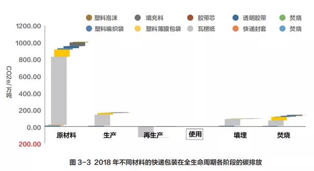 塑料薄膜包裝在原材料、生產和焚燒階段的排放所占比重僅次于瓦楞紙,原材料階段達 62.31%,焚燒和生產階段各占 22.69% 和12.92%。填充料主要是以 PE 為原料的塑料氣泡膜,也占一定的比重。不容忽視的是,2018年焚燒快遞包裝材料的碳排放量為 137.53 萬噸,其中塑料包裝為 64.86 萬噸,占總排放量的47.16%。