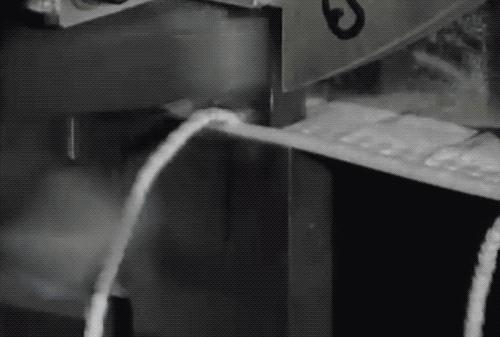 那為什么這么多天了,還會口罩緊缺呢?因為市場關系就是供不應求...作為一次性的消耗品,全國十幾億人都想每天人手要幾個,一下子爆炸式的需求量,再加上原材料供應緊張,制造大國緊急復工,晝夜趕工,一時也供應不上... 這樣的三層無紡布原料,就是經過下圖這樣的生產機疊合在一起。 有沒有注意到這臺機器的左上角這個小喇叭?有條串線穿過喇叭口不停地往里送。 這就要看口罩的第二個結構:口罩上部那根可彎折的金屬絲。佩戴的時候要捏合鼻夾固定到鼻梁上,這樣戴口罩才會嚴實,不然沒這結構的話,我這種塌鼻子漏風是比較嚴重的,密封不嚴密,影響防護效果... 來看一個特寫,就是沿著無紡布的一側匹配輸送金屬絲,然后下圖結構一卷邊,后面再一縫合,就搞定了。