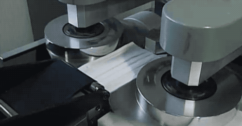 左右兩大卷無紡布,等著要補強口罩邊沿了。 一側被包裹之后,立刻壓平粘合。 這時候出來的原先已經裁斷好的口罩們,再次被連到了一起,這真的是自古多情空余恨,此恨綿綿無絕期... 所以還需要一個裁斷補強邊的環節,一刀兩斷...