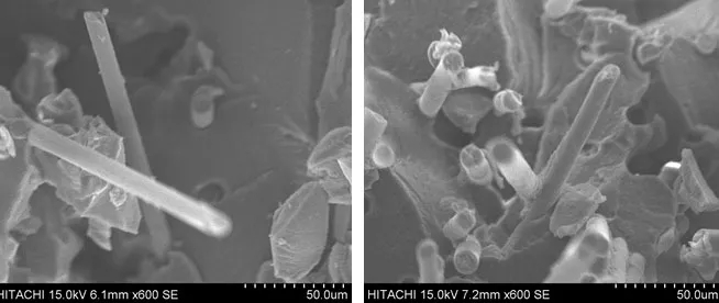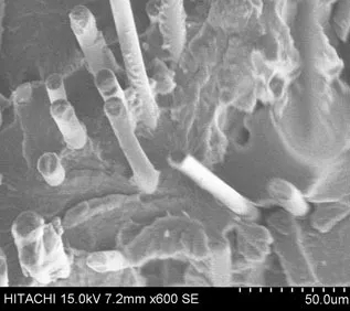 ????????由下圖可知,未添加POE-g-MAH的PA66體系中,玻纖與樹脂之間有良好的結合,其玻纖上有明顯的尼龍樹脂的包覆。
