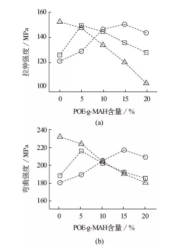 ????????目前,增韌劑對玻纖增強的高溫尼龍材料的研究報道較少,基于此,固定玻纖的質量分數為20%,采用雙螺桿擠出機制備基于PA6T/66及PA10T的POE-g-MAH增韌高溫尼龍材料和POE-g-MAH增韌PA66材料,研究了增韌劑POE-g-MAH對高溫尼龍復合材料的力學性能的影響,探索增韌劑改善高溫尼龍玻纖增強復合材料的可能機理。