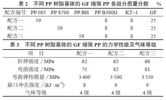 ????????可以看出,無論PP基體是粉料還是粒料,不同配方材料的氣味等級均為4 級。由此推測在GF增強PP體系中,氣味的最根本來源在于相容劑PP-g-MAH