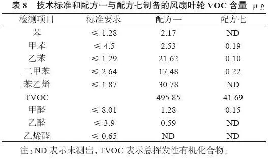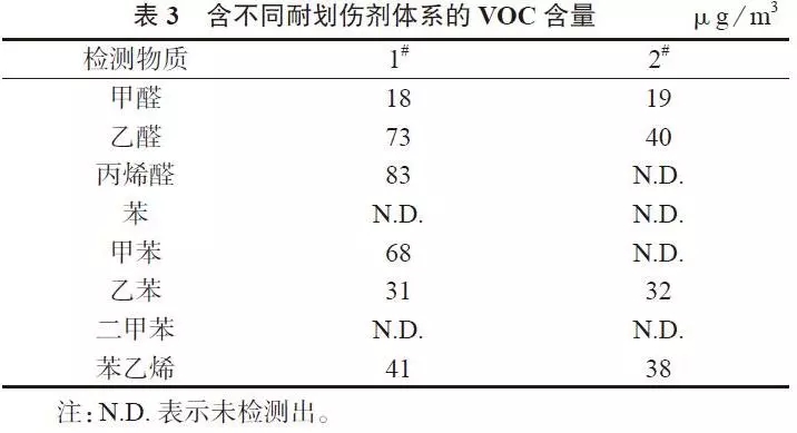 ????????1# 和2# 所散發的總揮發性有機化合物(TVOC) 含量分別為18.47 μgC/g和14.16 μgC/g,兩個體系的TVOC含量均滿足要求( 低于50 μgC/g)。但從表中可以看出,2#在氣味等級和VOC方面總體上均低于1#。