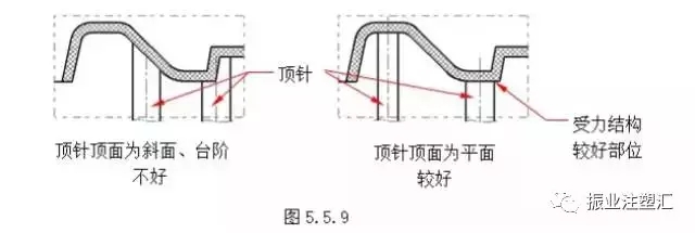 ????????(3)避免跨臺階或在斜面上設置頂針,頂針頂面應盡量平緩,頂針應布置于膠件受力較好的結(jié)構部位。如圖5.5.9所示。