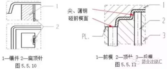 ????????(4)在膠件較深的骨位(深度≥20mm)或難于布置圓頂針時,應使用扁頂針。需要使用扁頂針時,扁頂針處盡量采用鑲件形式以利于加工。如圖5.5.10