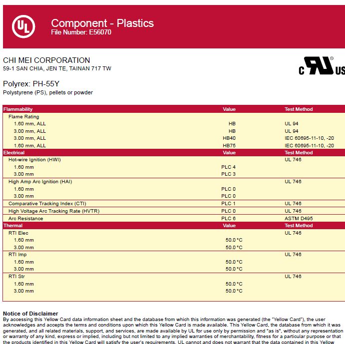 Min. Thick. 試片最小厚度 單位為mm。在上述黃卡中,試片厚度為3mm時,難燃性為5VA。試片厚度為1mm時,難燃性為5VB。