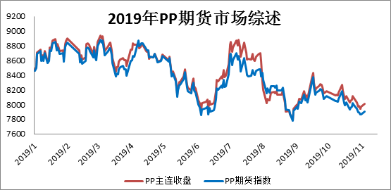????????2019年PP期貨價格全年呈現震蕩下跌走勢。其中3月中旬到4月中旬、6月初到7月初、8月底到9月中旬有階段性反彈,在每次價格反彈后仍是繼續下行探底。縱觀全年價格走勢,按照PP主力收盤價格看,3月4日8936元/噸創年內最高點;截止目前,8月29日創年內最低點7787元/噸。年內高低點價差1149元,振幅12.9%,按照最高價格和最低價格計算,最大振幅13.7%。