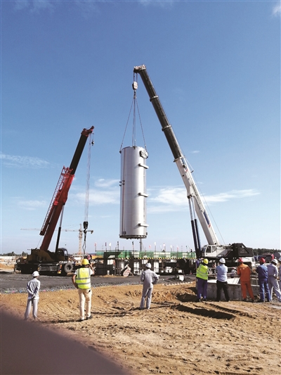????????11月2日,中國化學工程第六建設有限公司承建的海南華盛26萬噸/年非光氣法聚碳酸酯(PC)項目3臺導熱油爐主體吊裝一次性就位。