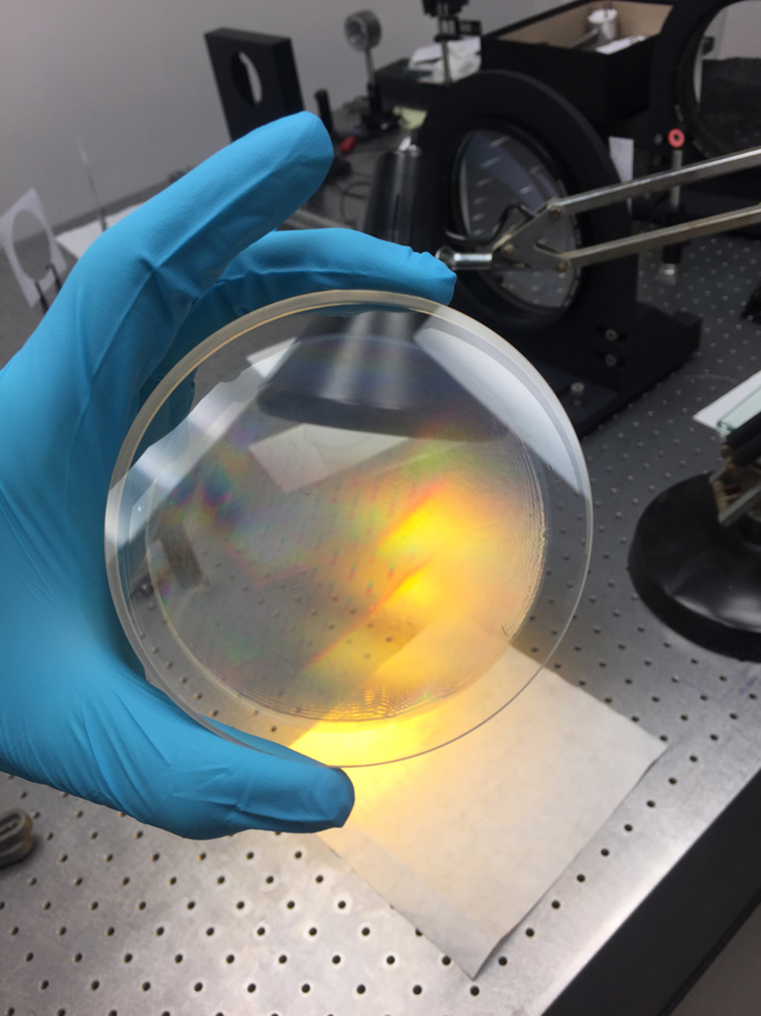 ????????意大利國家天體物理學研究所(INAF)正在研究基于體積全息圖的全息光學元件,該全息光學元件可以非常有效地將恒星發出的光分解為不同顏色,以便進行光譜研究。在與材料制造商科思創的多年合作中,其量身定制的Bayfol?HX光敏聚合物膜被證明是能幫助高性能望遠鏡穩定重復地作出高效體積全息圖的理想選擇,適用于每種截然不同的新穎光譜儀。這樣就可以使用適當的激光曝光設置下,將周期性折射率圖案靈活地刻入Bayfol?HX薄膜的體積中。如此,星光就可以被非常有效地衍射。與現有的棱鏡相比,Bayfol?HX薄膜能將星光更有效地分離成其光譜分量。