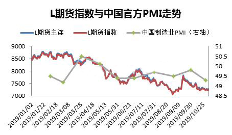 ????????PMI是經濟先行指標中一項非常重要的附屬指標,具有其高度的時效性。目前全球已有20多個國家建立了PMI體系,有關機構已開始建立全球指數和歐元區指數,PMI指數及其商業報告已成為世界經濟運行活動的重要評價指標和世界經濟變化的晴雨表。如圖所以,2019年3月份回升到50的臨界值之上,對應的PE價格在第一季度的震蕩;3月份之后PMI一路下行,PE價格幾乎同步跟隨。