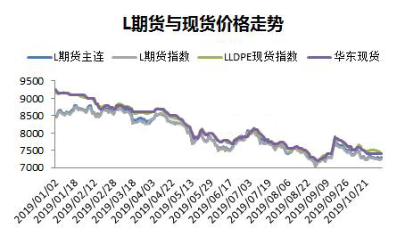 ????????2019年月初以來價格數據顯示,PE期貨和現貨相關度極高,幾乎同步漲跌,因此以下的分析,取期貨價格指數跟宏觀指標對比。