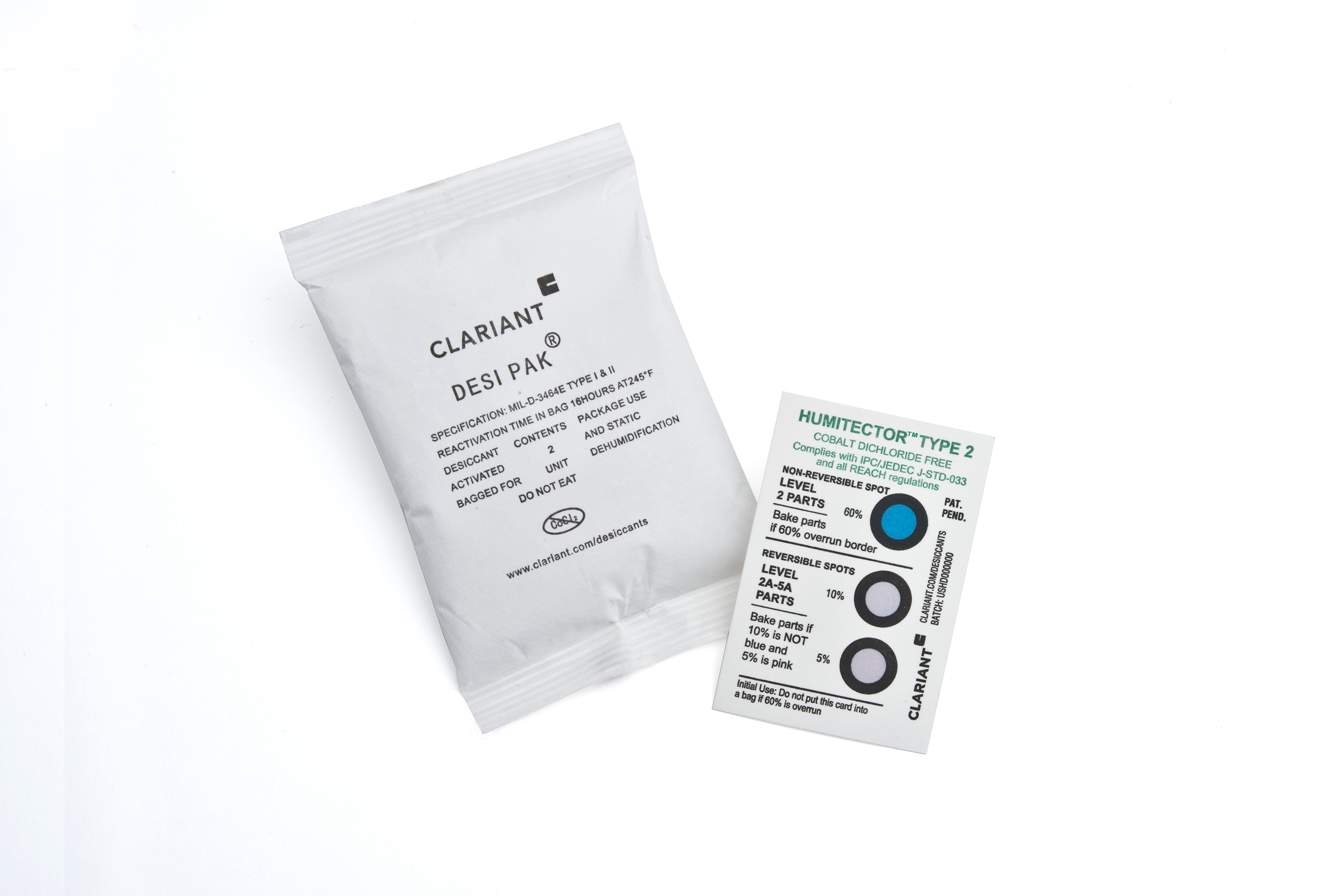 ????????為了緩解此類問題,行業(yè)標(biāo)準(zhǔn)要求將SMD置于防潮包裝(干燥包裝)中進(jìn)行運(yùn)輸和存儲(chǔ)?!案稍锇b”由防潮袋、干燥劑(如科萊恩的Desi Pak? 膨潤(rùn)土干燥劑)和濕度指示卡(如科萊恩的Humitector)組成。濕度指示卡可以通過在不同的濕度環(huán)境中濕敏色點(diǎn)顏色的變更,指示環(huán)境中是否存在水分。傳統(tǒng)上,這些指示色點(diǎn)中的濕敏材料使用的是鹵素化合物,例如二溴化鈷(CoBr2)、二氯化銅(CuCl2)或二溴化銅(CuBr2)。