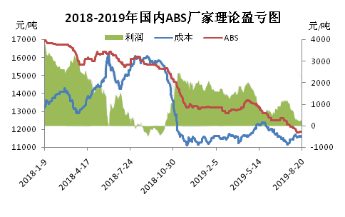 ????????自2019年4月中旬起,國內(nèi)ABS市場(chǎng)開啟持續(xù)下滑走勢(shì)。截至8月20日,華東ABS市場(chǎng)國產(chǎn)料主流報(bào)盤在11450-12300元/噸,而國產(chǎn)ABS企業(yè)理論生產(chǎn)成本至11571元/噸。部分低端ABS已跌破理論生產(chǎn)成本線,高端料理論上盈利水平亦縮至低位。成本面支撐下,ABS市場(chǎng)表現(xiàn)出一定的抗跌性。