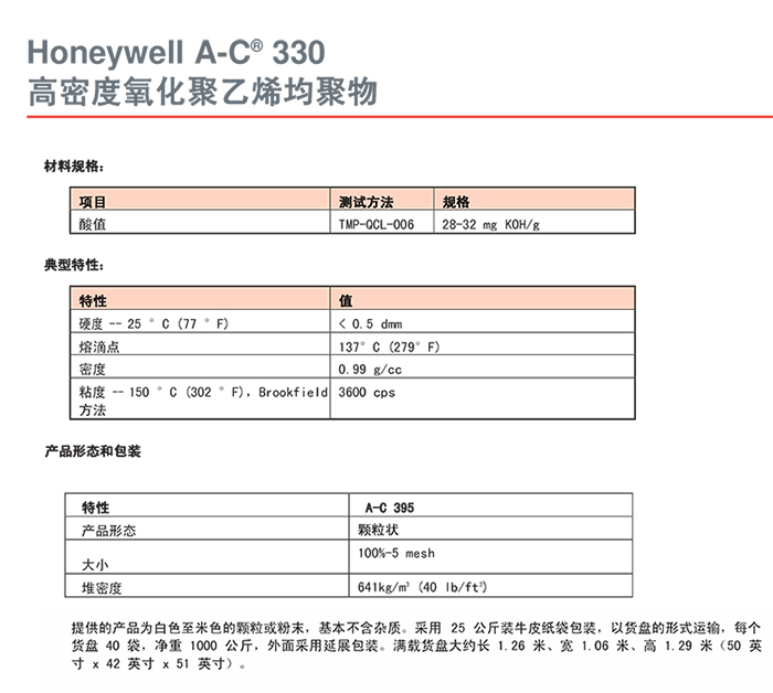 - Honeywell霍尼韋爾 A-C 330 蠟粉 高密度氧化聚乙烯蠟 物性表, Honeywell霍尼韋爾 A-C 330 蠟粉 高密度氧化聚乙烯蠟 產(chǎn)品參數(shù),Honeywell霍尼韋爾 A-C 330 蠟粉 高密度氧化聚乙烯蠟 性能表,Honeywell霍尼韋爾 A-C 330 蠟粉 高密度氧化聚乙烯蠟 出廠報(bào)告, MSDS,, 物質(zhì)安全資料表, UL黃卡,{ SGS報(bào)告, RoHS, 食品級(jí)認(rèn)證, NSF飲用水標(biāo)準(zhǔn), 產(chǎn)品資料, 產(chǎn)品性能, 出廠報(bào)告, 原廠原包, 代理商, 熱變形溫度, 熔指數(shù), 流動(dòng)系數(shù), 抗沖擊性能、沖擊強(qiáng)度, 低溫韌性、低溫抗沖擊性能, 熔體流動(dòng)系數(shù)、熔體流動(dòng)速率, 加工工藝、加工參數(shù)、加工溫度, 歐盟RoHS 德國FDA 美國FDA 日本FDA