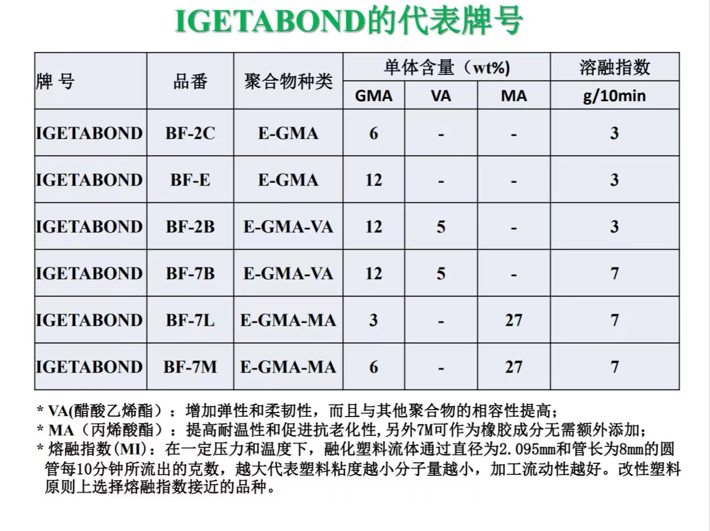 比如最有代表性的牌號BF-7M,可以直接用來添加3-5%來改善GF-PBT復合材料的抗沖擊性能。也可以直接用來代替目前市場上廣泛應用的國外進口改性劑。